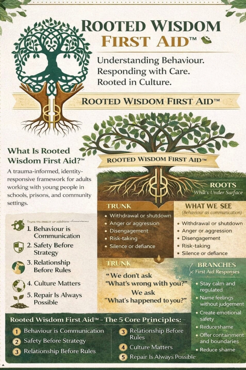 Rooted Wisdom CIC is a UK-based, trauma-informed organisation supporting Black and marginalised young people across prison, school, and community settings. We work relationally with young people and the professionals around them to support emotional wellbeing, identity development and long-term change. Rooted in psychodynamic, trauma-informed and culturally responsive practice, we believe: